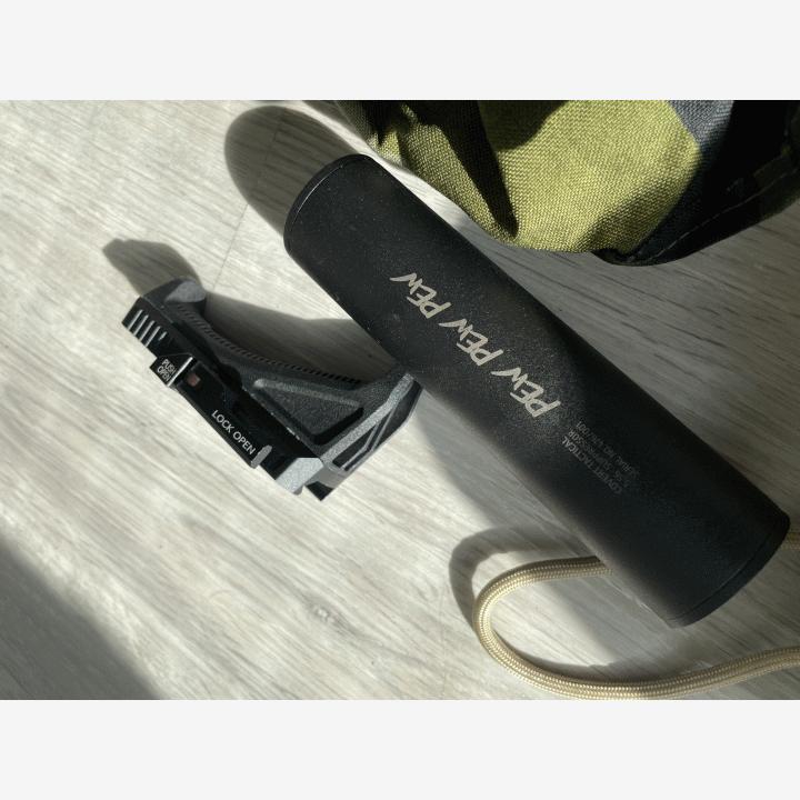 - QD AFG-kahva, kuin uusi. 10€- Äänenvaimennin, jotain raapamaa kiskosta peräpäässä, mutta hyväkuntoinen silti. Kyljessä Covert Tactical ja Pew Pew Pew tekstit.10€