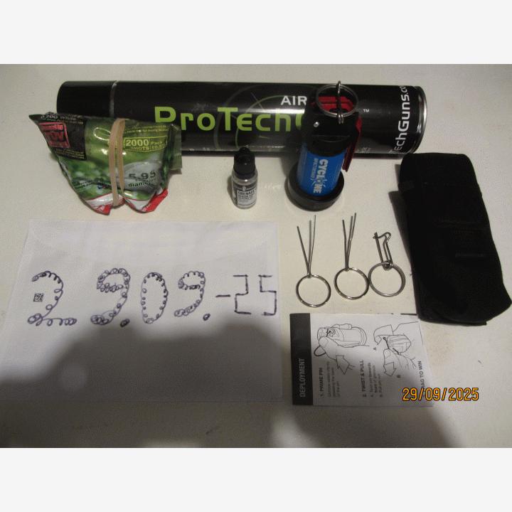 Myydään ok pätevä ponnekaasulla toimiva kranaatti jota ei testailuja enempää ole käytetty. Metsäiseen maastoon ei paras valinta, kevyet heitot vaatii kovan alustan, tyyliin asfaltti tai vanerilevy. Vähänkään pehmeä alusta niin täytyy olla vähän enempi lentorataa jotta iskeytyy kunnolla maahan.