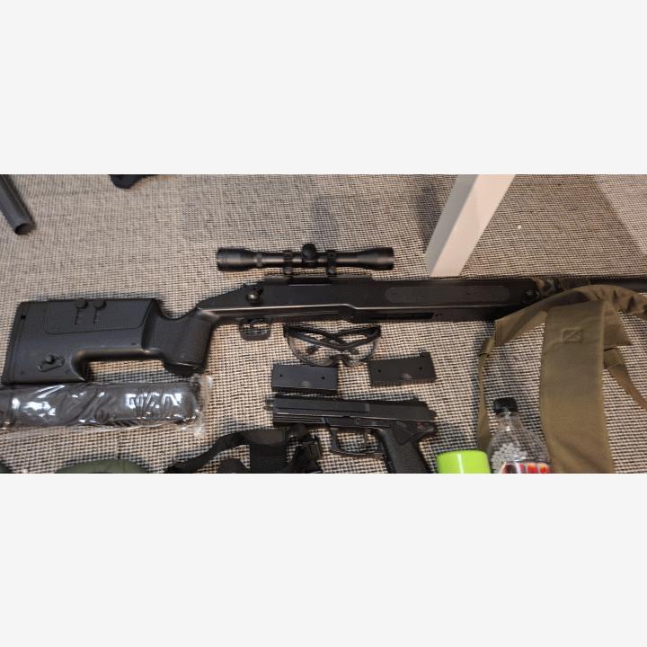 M40/m62 sniper 2 lippaalla ampuu 1,6 J 0,32 kuulalla aika tarkasti ovh 200eAsg valmistama Mk23 kaasu pistooli supressor puuttuu. Ampuu noin 1,0 J 0,25 kuulalla 3 lippaalla mikään ei vuoda