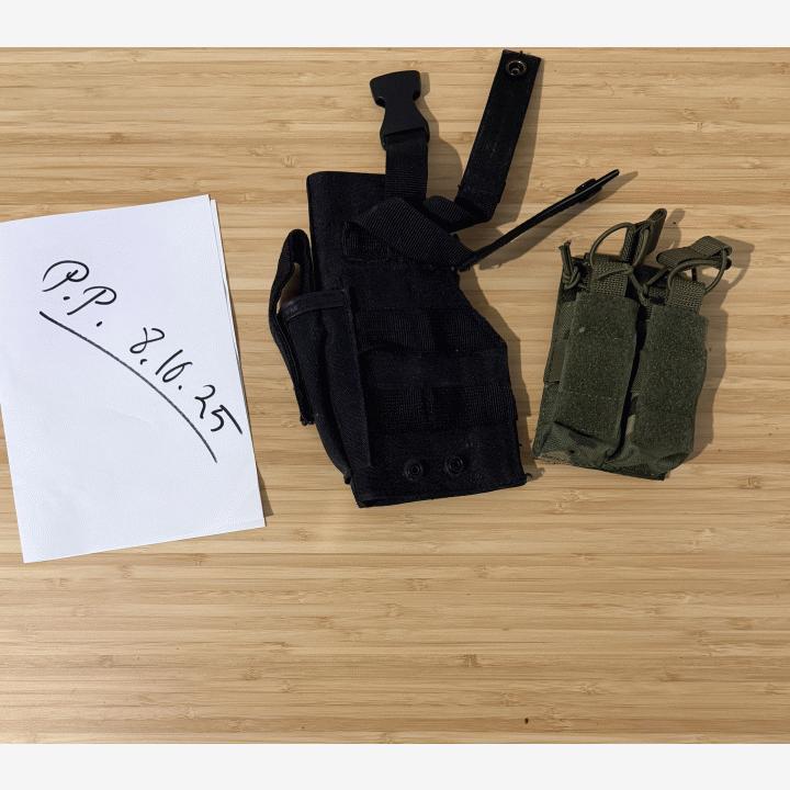 Musta, pitkä aselaukku jossa paljon taskuja ja jos jonkun näköistä hihnaa.