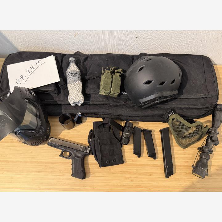 Nyt on jäänyt nurkkiin juniorilta kasa kamoja, joille ei enää käyttäjää.En osaa kertoa näistä mitään, poika sanoo että ase toimii. Pölyt saa kaupan päälle.