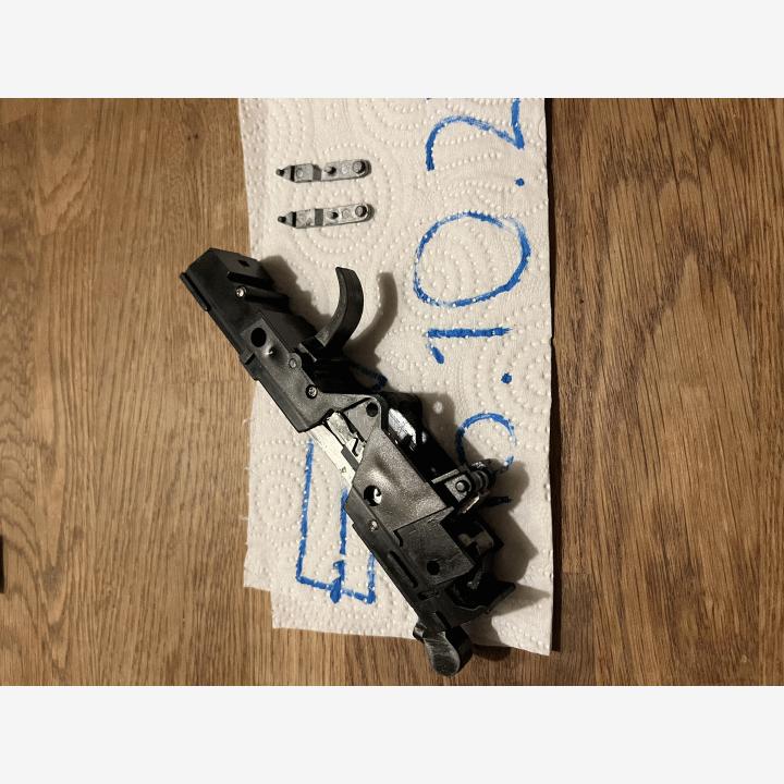 -vakio ASG mk23 liipaisinkoneisto. Liipaisin ja vasara ovat ulkoisesti kuluneet/kulutetut, mutta kaikki näytti toimivan ihan normaalisti.