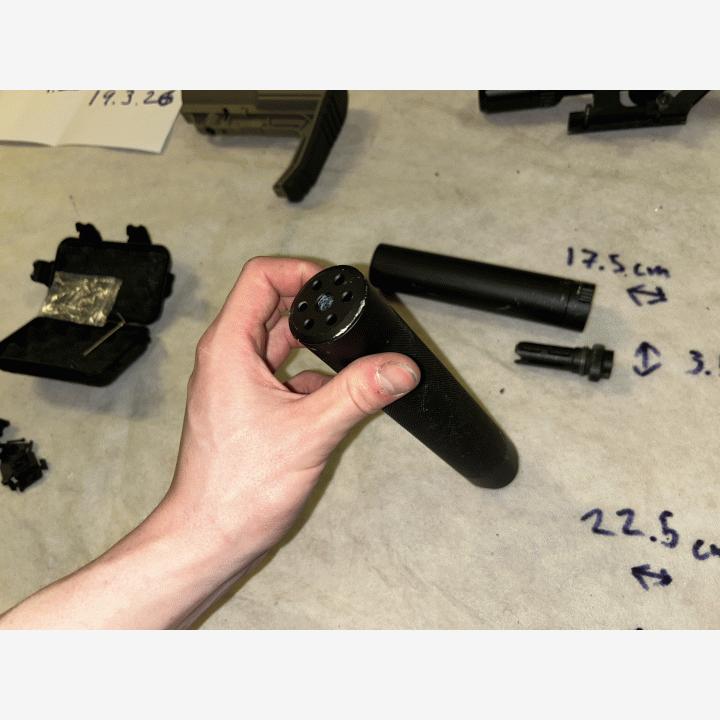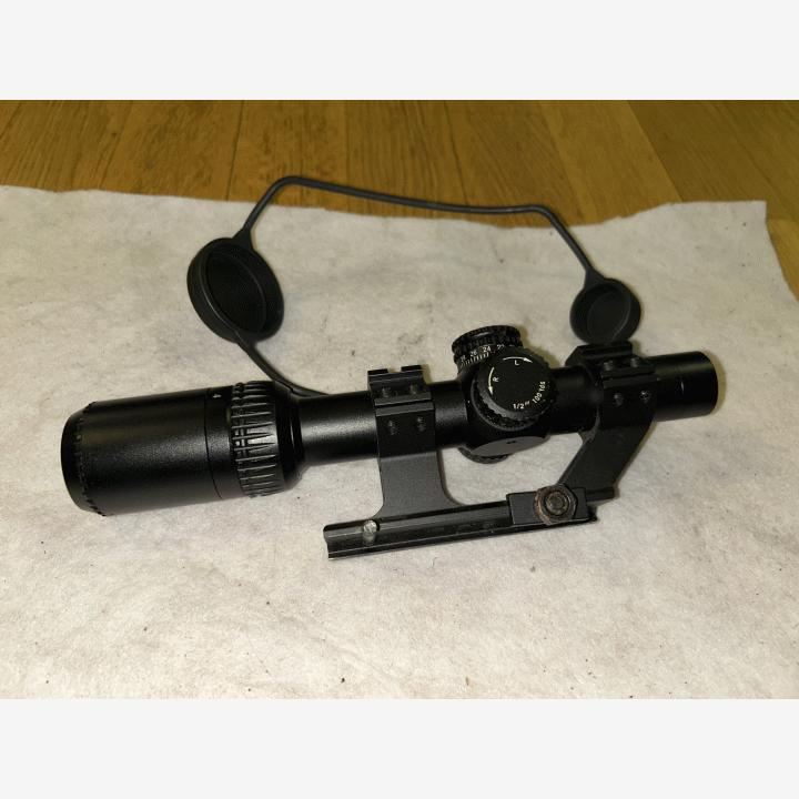 Lpvo 1-4x pitkällä eye reliefilla (huom toinen jalan kiinnikke hävinnyt) myytyQd äänenvaimennin liekin sammuttimella myyty