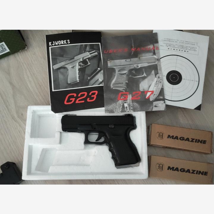 -KJW g23 GBB pistooli ja kaksi lipasta. Aseen luisti jumittaa yhden tai kahden laukauksen jälkeen, vaikka liikkuu hyvin. En tiedä auttaisiko puhdistus tai hiomapaprun näyttäminen.