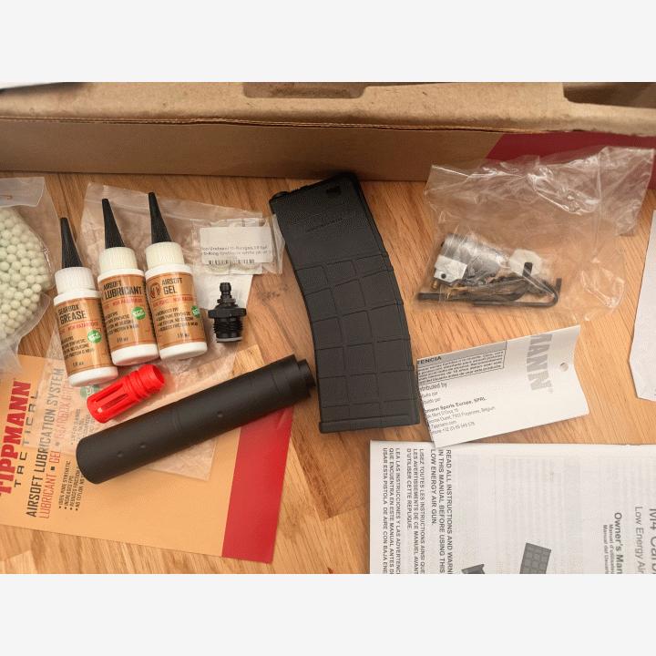 Mukaan kaikki kuvissa näkyvä & alkuperäinen käyttöohjeita ja CO2-konversiota myöten, sekä kuulaa, joku random silu, slingi ja huoltotarpeita. Painepullo ja ase myös juuri testattu ja toimii.