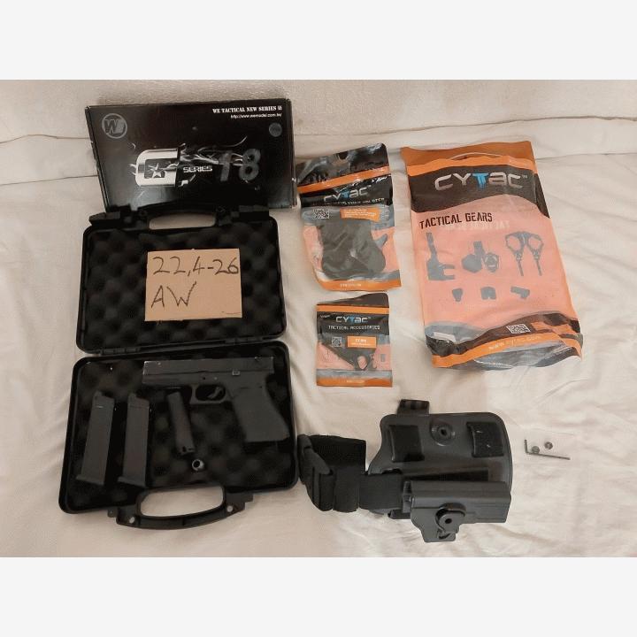 WE Glock 18 kaasupistooli tarvikkeineen, pistoolilaukulla ja Cytac reisipaneelilla, molle ja vyö kiinnikeellä sekä oikeakätisellä pistoolikotelolla.