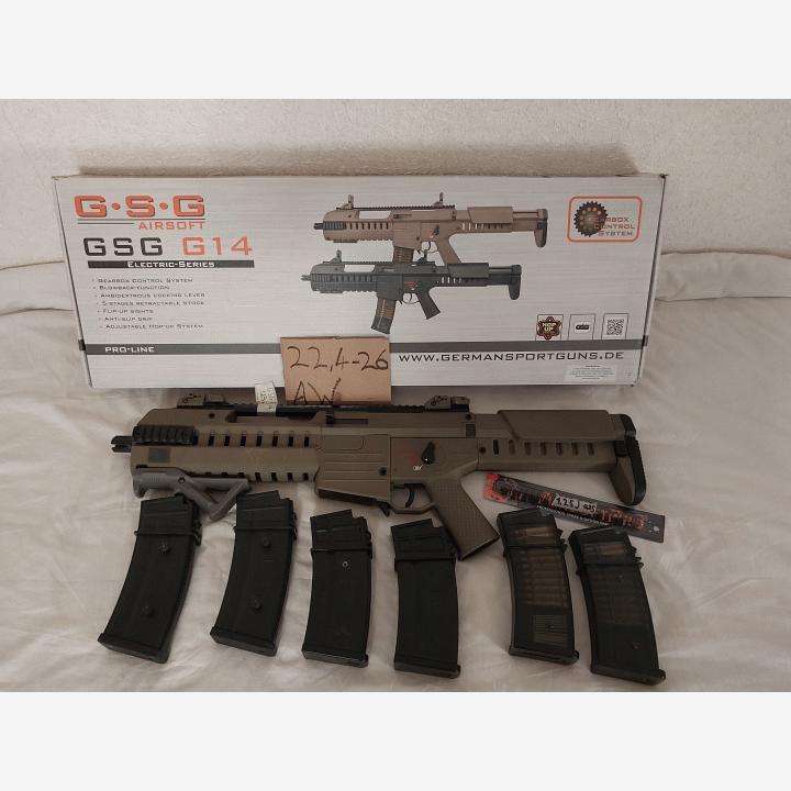 GSG G14 EBB. Aseessa sähköinen blowback toiminto. Pyssyyn on 4 lipasta ja vaihtojousi. Ampuu kerta ja sarjatulen lisäksi 2 laukauksen pursketulta.