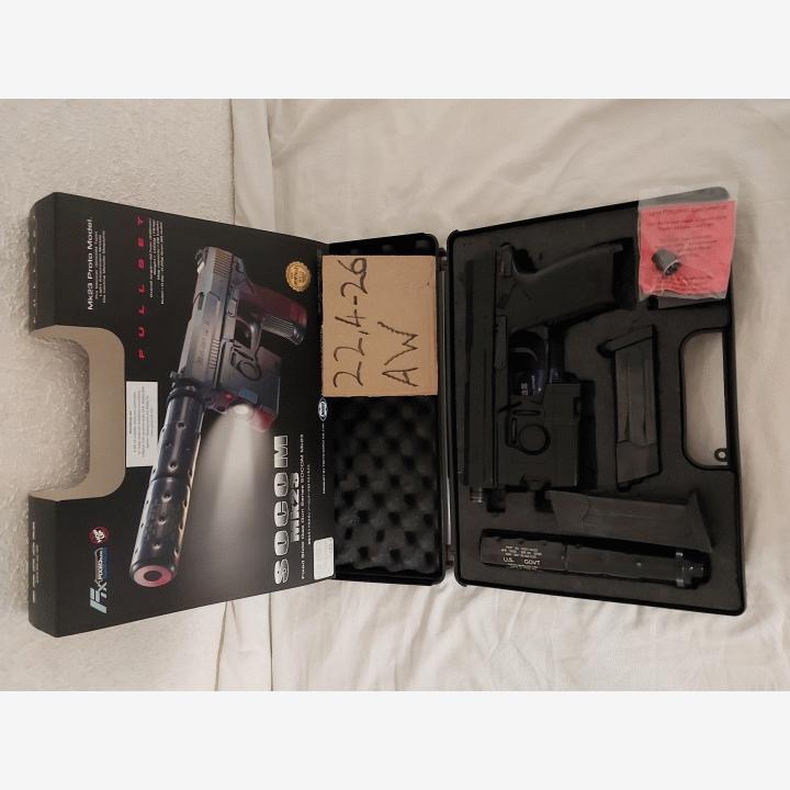 Marui MK23 kaasupistooli lisätarvikkeineen.
