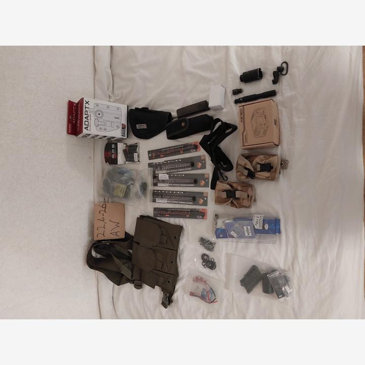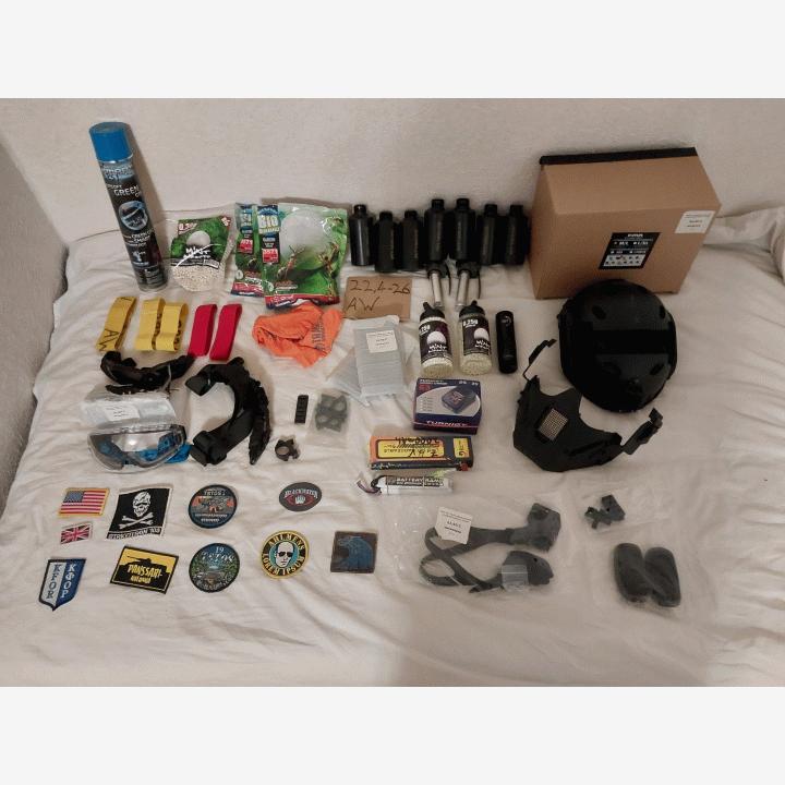 Äänikranaatin ytimiä pari ja kuoria sekä tarvikkeita. Valojuovalaite ja siihen kuulia. Kypärä on Fast PJ kokoa M/L ja säädettävissä. Menee alushupun kanssa 58 koon päähän.