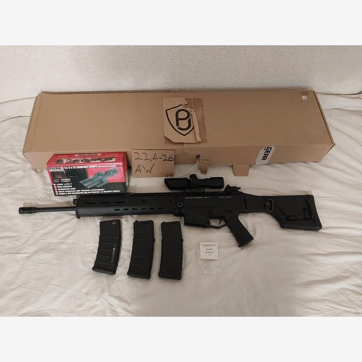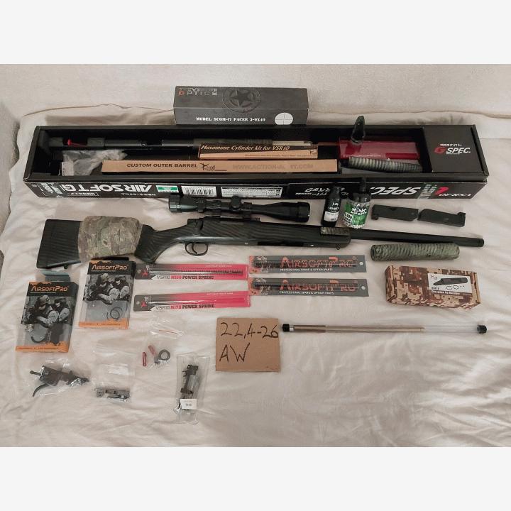 VSR10 G-spec jousitoiminen kivääri. Pyssyyn vaihdettu airsoftpro 90 asteen liipasinkoneisto ja mäntä. Ulkopiippu Action armyn uritettu piippu ja sisäpiippu Madbullin 6.02mm tarkkuuspiippu. Airsoftpron vaimennin on varusteltu 3d tuloste sisäelementeillä, elementit vaimentaa oikeasti hyvin. "Lukkorunko" on action armyn yksiosainen runko ja lukkosylinteri masamunen teflon päällystetty. Sisällä actionarmyn m170 tason jousi ja mukana myös actionarmyn m150 tason jousi. Tähtäin on Vector optics pacer 3-9x40. Alkuperäiset osat tallessa, joten et tarvitse kuin toisen tukin lisää johon laitat ne kiinni niin sulla on sitten jo kaksi vrs kivääriä.