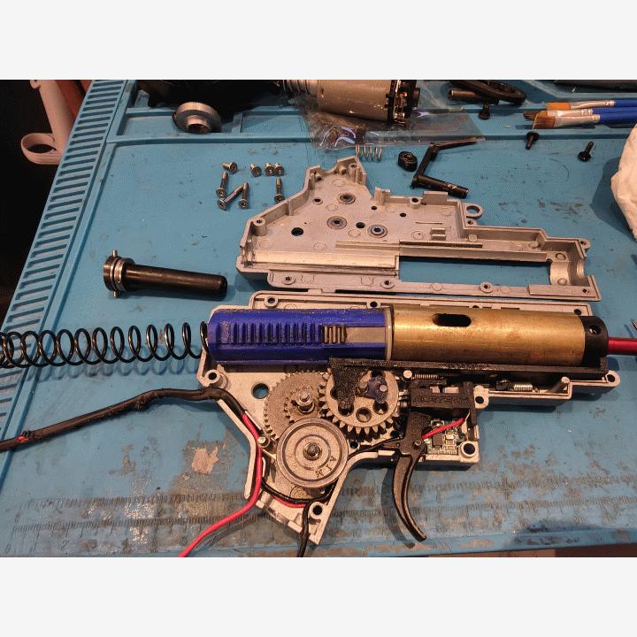 Jonkin verran päivitetty g&g cm16. Ylärunko ja ris metallia g&p muuten g&g. Ampuu alle joulea 0.25g. Sisälle laitettu SHS mäntä ja männänpää, messinkinen sylinteri, SHS Alusuutin, teräs puslat/laakerit, aimtop ratas sarja, specnan rotory kammio, madbull shark kumi, acetech fetti ja specnan advanced moti.Mukaan tulee pari eri koventajaa, magwell grip plus 3 vaihto osaa ja poistettu fake bolt.