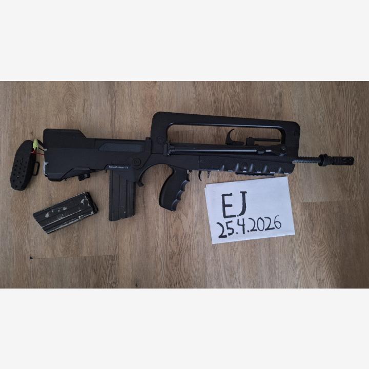 Famas F1 (Tokyo marui, kai?) - Ostin epäkunnossa projektiksi joku pari vuotta sitten, arvioisin. Se projekti on toki jäänyt vain kaapin pohjalle. Tukkia ei saa kunnolla kiinni, koska ruuvi on selvästi jäänyt jumiin, hoppi todennäköisesti epäkunnossa, ja osat kiinnitetty vähän siten täten. Sähköt pelaa toki. Mukaan ekstra lipas. 50e