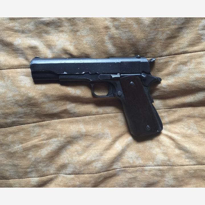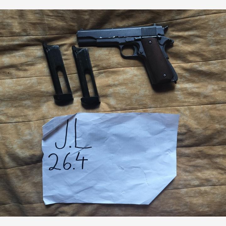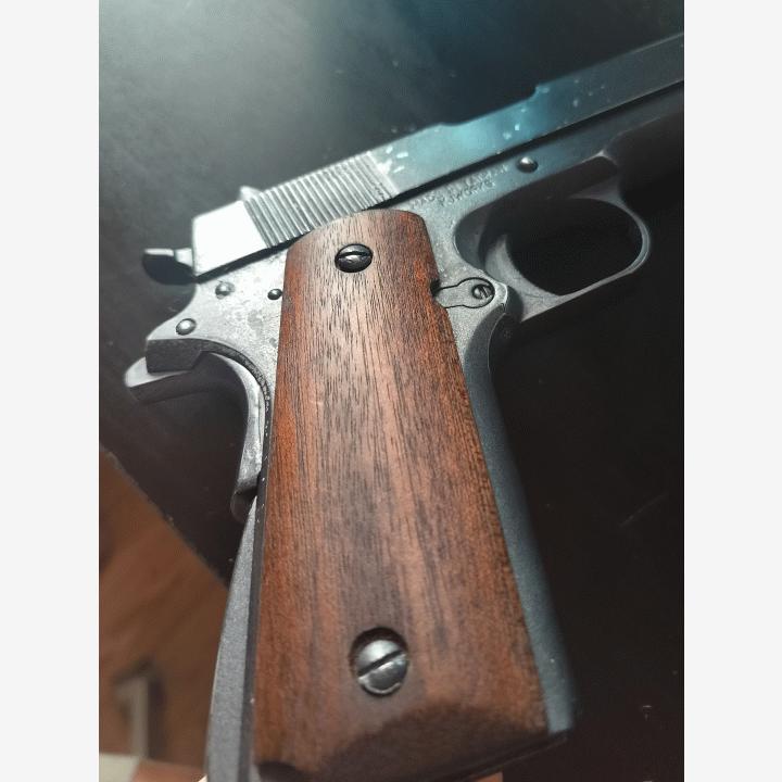 Vanha KJW CO2 1911, maalattu jollain automaalilla harmaaksi, maalipinta ottanut sitten osumaa, mutta mun mielestä näyttää jopa kivemmalle näin.Vaihdettu pähkinäpuiset kahvatlevyt.