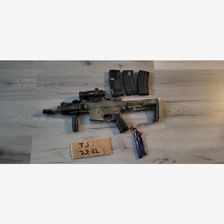 Myydään kerran pelattu KAC ! Ase on rakennettu laadukkaista osista itselle, mutta aika ei riitä pelaamiseen joten joutaa seuraavalle.Ulkoisesti simppelisti muokattu, Bullgearin cnc perä adapteri, perä minimalist, tähtäin Vector Opticsin punapiste, etukahva aseen mukana tullut kac kahva (rikki). Edessä ja takana QDhihna paikat. Pistoolikahvan mallia en muista. Akku mahtuu bufferiputkeen ja perän saa säädettyä lyhyimmälle asetuksellekin !