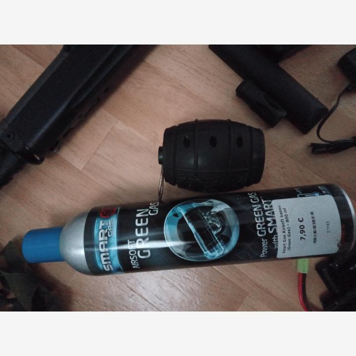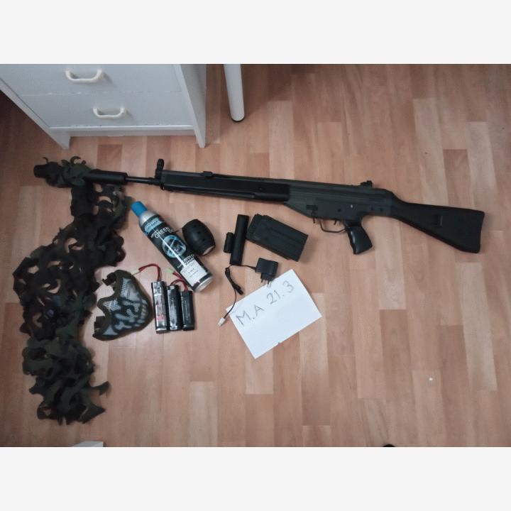 Jing Gong g3a3 johon vaihdettu piippu jonka suojaksi on laitettu änkkä, myös koneisto (pikajousen vaihdolla) on vaihdettu. (m120 jousi) Mukaan kranaatti ja kaasu sekä maski ja aseen naamio verkko, 3 akkua, 2 hi-cap lipasta joista toinen puolikuntoinen. Nouto p.0404147225 (10.8v akku 15€ ja kranaatti kaasun kanssa 45€) voidaan myydä erikseen