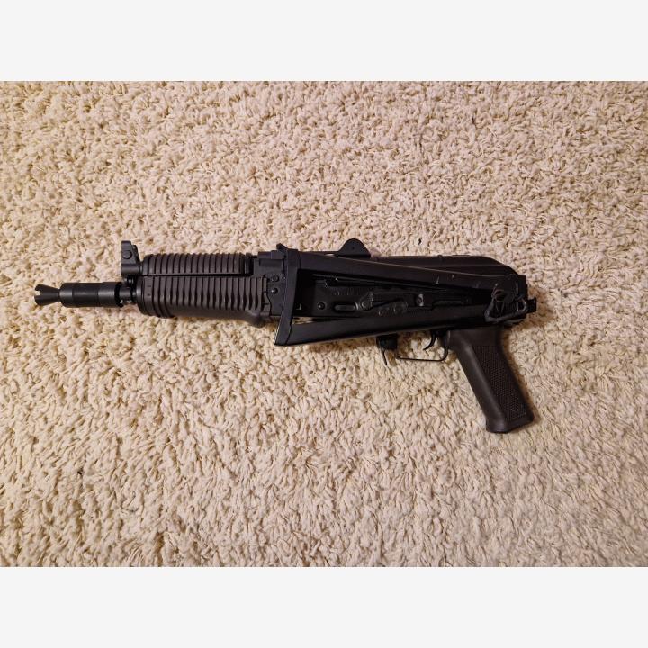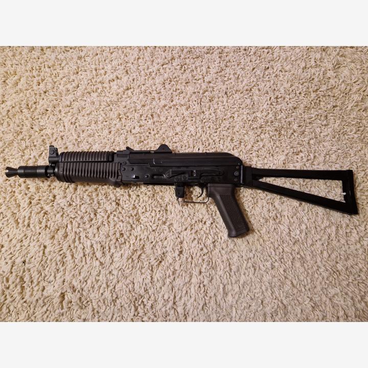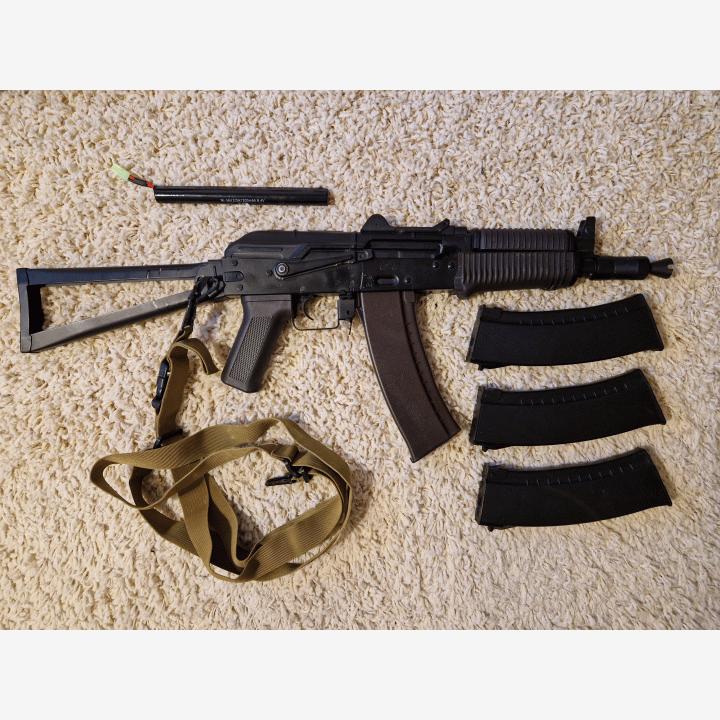 Muutamia pelejä pelattu Cyman AKS74-U. Runko ja tukki metallia. Ammuttu tänään (5.4.) tyhjänä sekä kiristetty löystyneitä osia. Lisätty myös O-rengas jämäköittämään tulenvalitsijaa.Mukana ase, neljä lipasta, kantohihna ja yksi akku (mahdollisesti myös toinen, mikäli löydän), sekä alkuperäinen paketti.