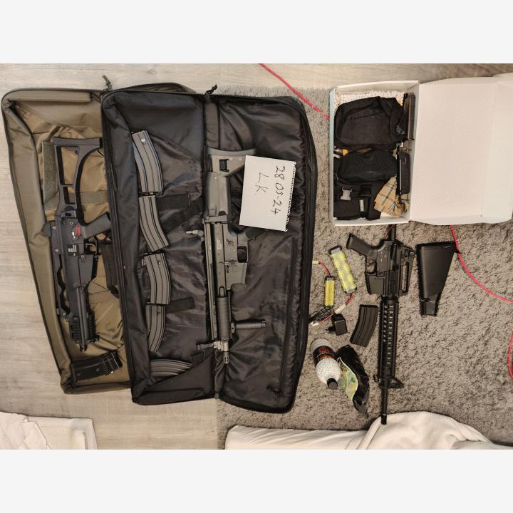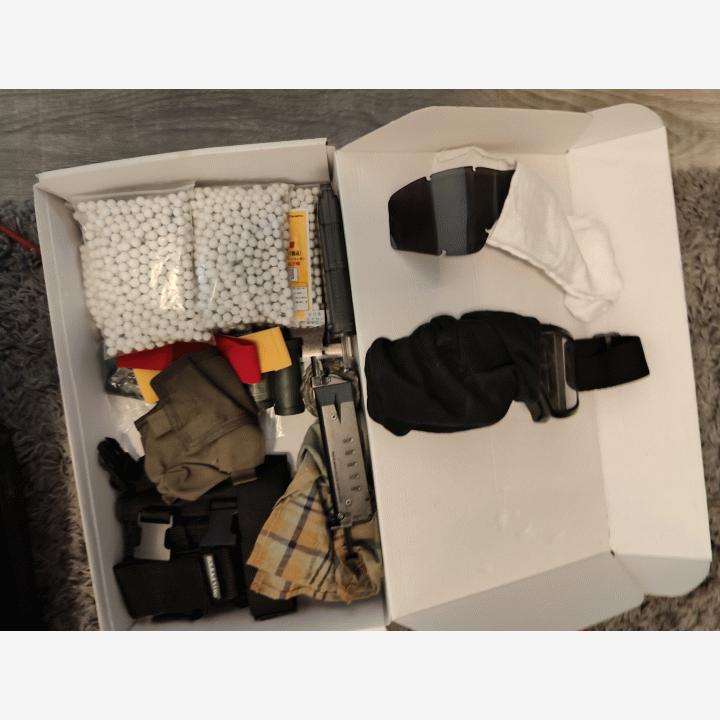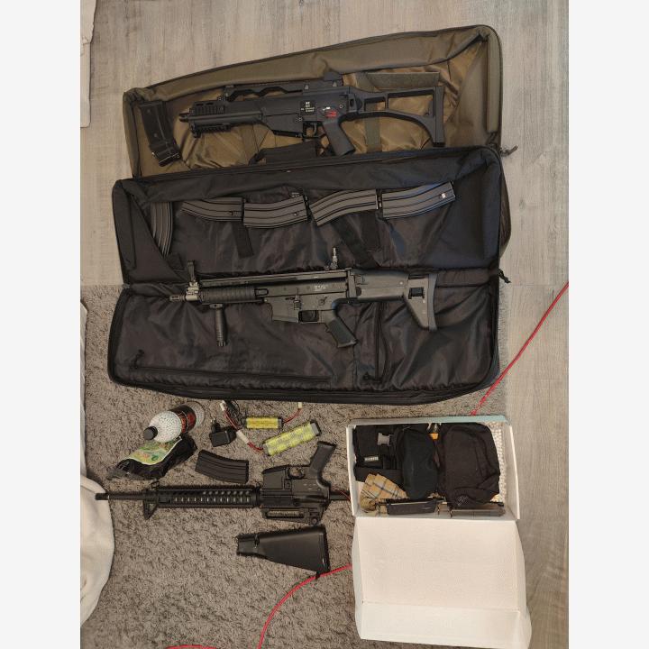 WE 999C, MK16 MOD 0, M4 (rikki) aseet, kuulia, naamiointivärejä, remmejä, pussukoita, suojalasit, bb loader ja marui bb loader, vähän naamiointi teippiä, asekassit 2kpl, muutama patteri (toimivuudesta ei takuuta) lippojaMyydään kaikki kuvassa näkyvä KERRALLA pakettina