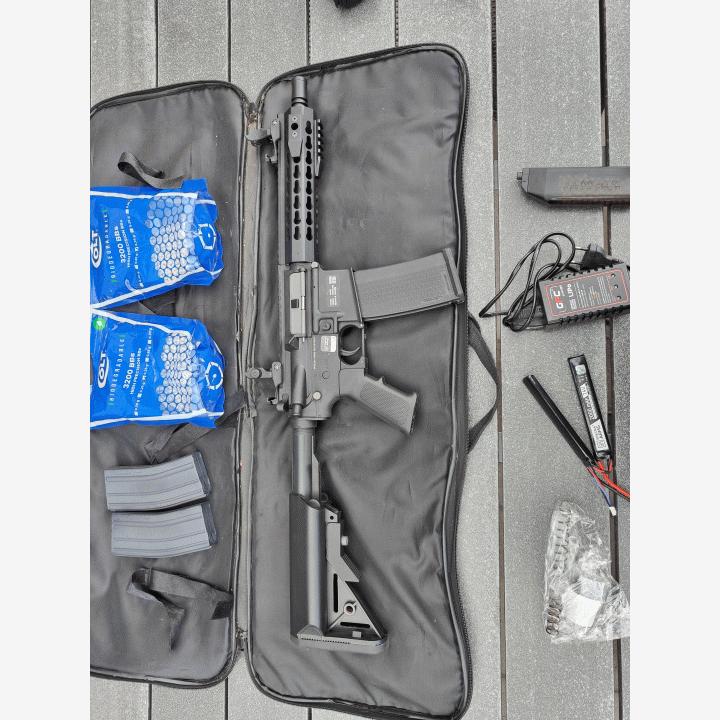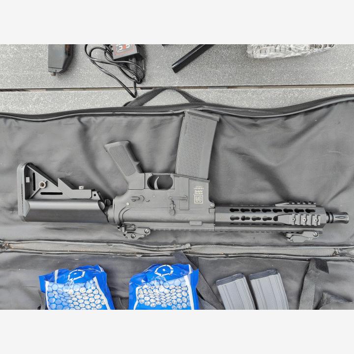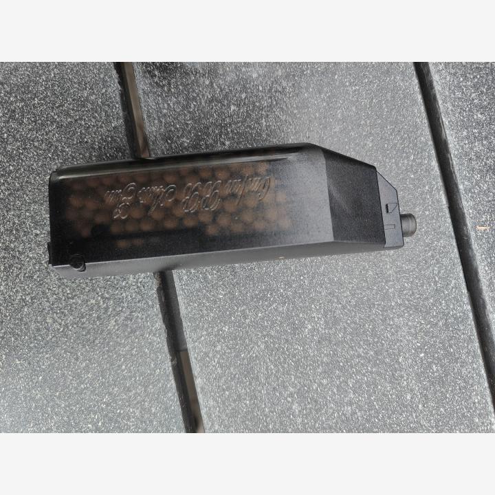 Sähkötoiminen kuulapyssy. Alkuperäinen jousi tulee mukaan, nyt kiinni on pidempi. Pari pussia 0.25g kuulia, laukku, lippaan lataus laite, hyvä kuntoinen akku ja pikalaturi sekä 3 kpl lippaita joista yksi on rullattava. Voi kysellä sekä tarjota. 050-4070765