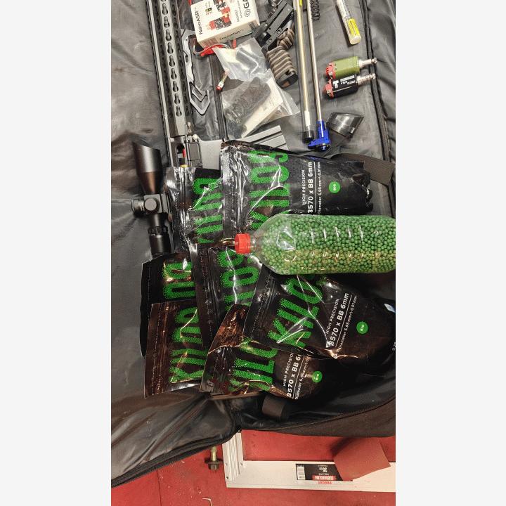 Aika harrastukseen loppui vuosia sitten joten nyt kaikki hyödyllinen seuraavalle.Aseesta sen verran muistan että hopin/kuulan syötön kanssa oli ongelmia ja musta high torque moottori saattoi olla vähän liian tehokas.