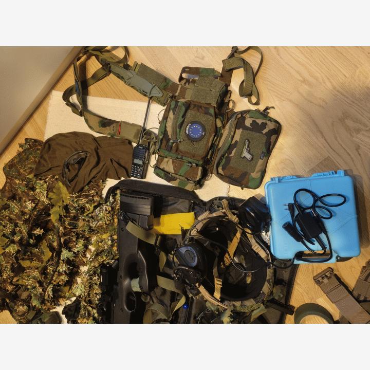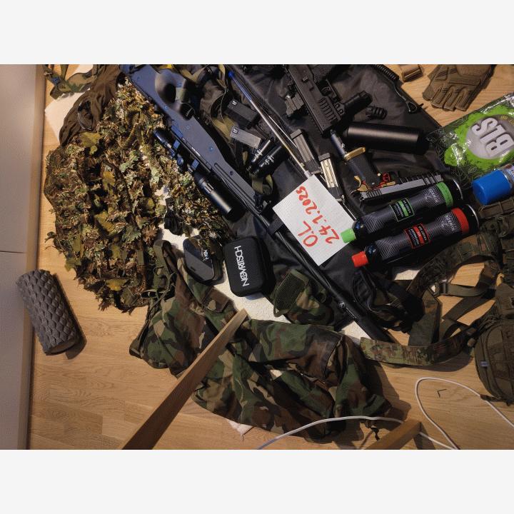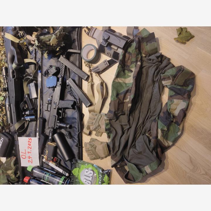 Koko airsoft setti myytävänä. Kamoilla on pelattu noin 15 peliä jonka jälkeen aseet aina puhdistettu ja rasvattu uudelleen. Mukana tulee novritschin ssg 96 2.7 joulen tehoilla ja uudella maple leafin precision innerbarrelilla. Aseet ampuvat ilman ongelmia ja kaasuaseiden lippaat eivät vuoda. Kaasupistoolina toimii AW custom HX 2001 kaasupistooli, sekä konepistoolina on VorskinVmp 1.