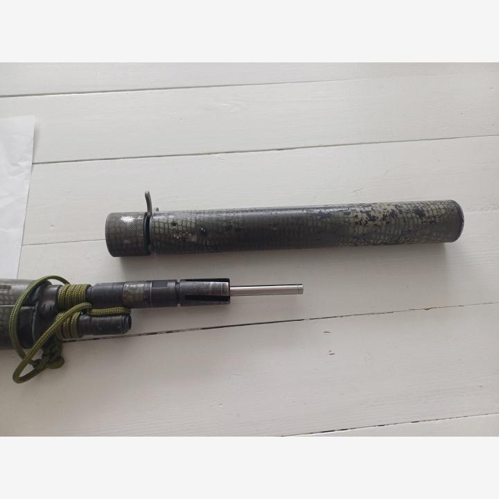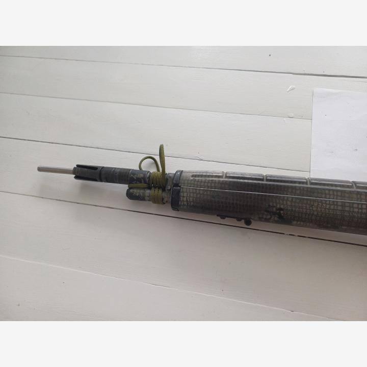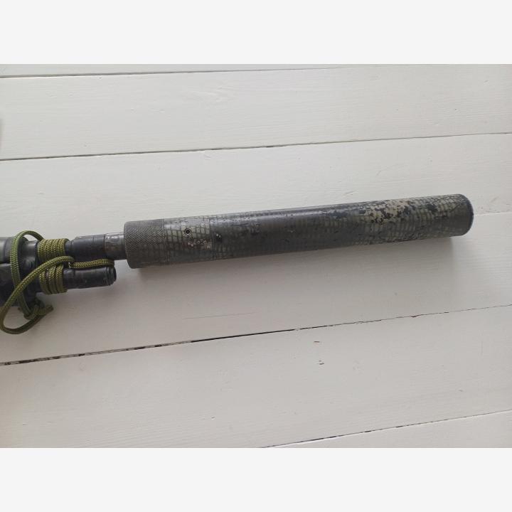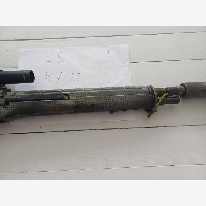 - Lyhennetty ulkopiippua ja poistettu etutähtäin. Tilalla X valmistajan vaimennin+liekinvaimennin kombo. Kuula pääsee hyvin vaimentimesta läpi ja vaimennin suojelee ylipitkää tarkkuuspiippua.