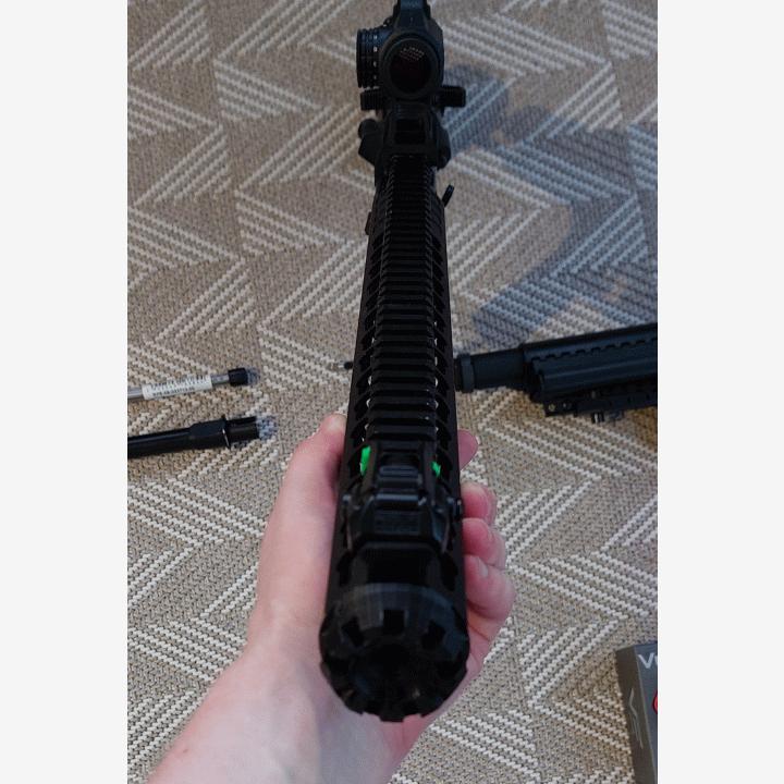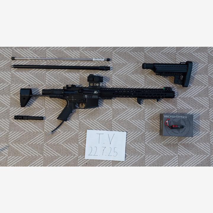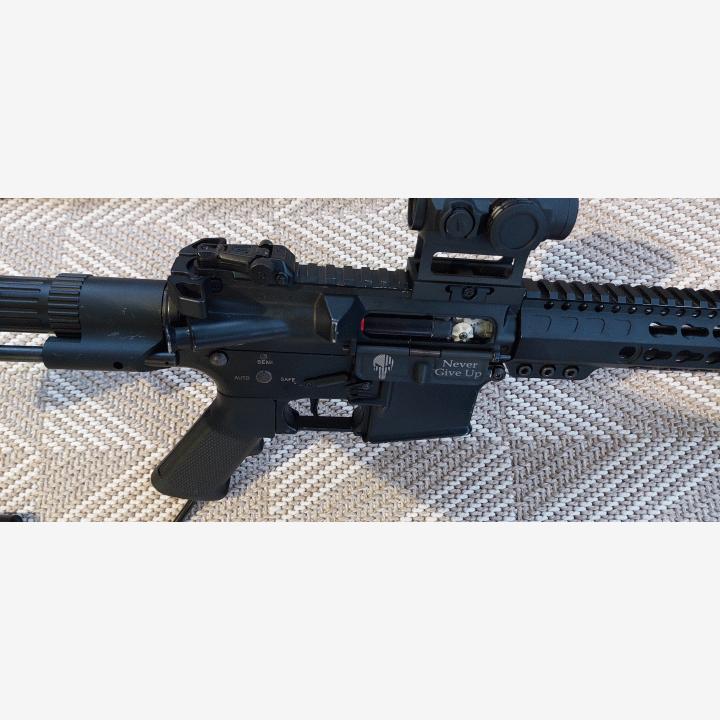 -muut custom ulko-osat kuten "butterfly" vetokahva, "ambi" mag catch, cnc valitsin, lukittu koneiston tappi ja laser-kaiverrettu hylsyportin suoja.