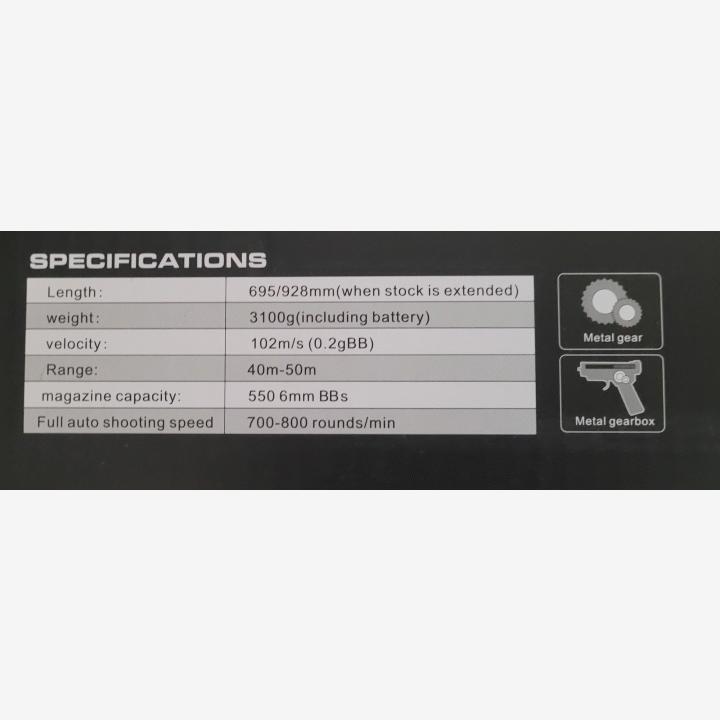 Aseen mukaan saa 5kpl specnan midcappeja 175rd, alkuperäisen hi capin, etukahva ja titanin 7.4v 3000mAh akku (mukaan ei sisälly laturia) Ase ampuu noin 1.1J ja 11 rps 0.28g kuulilla ja täydellä akulla. Pyssy on täysin vakio enkä ole huomannut mitään viallista
