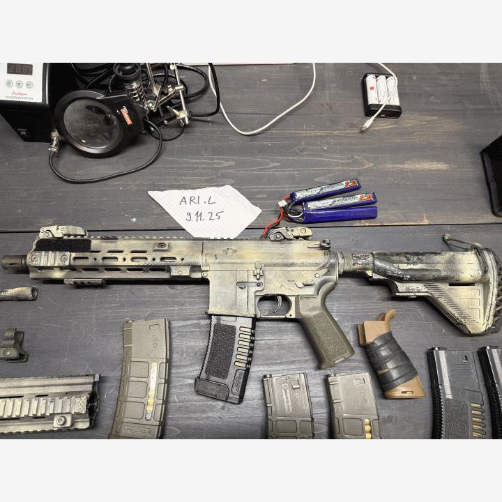 11.1v 2000mah LiPo mukaan, parhaat päivänsä nähnyt. Lippaita 10kpl, muovisia pmag tyylisiä.